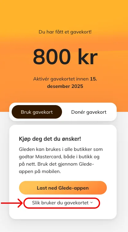 Når dette er gjort, vil gavekortet ditt bli synlig i Glede-appen.