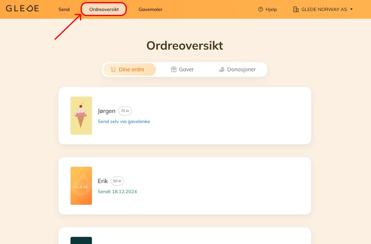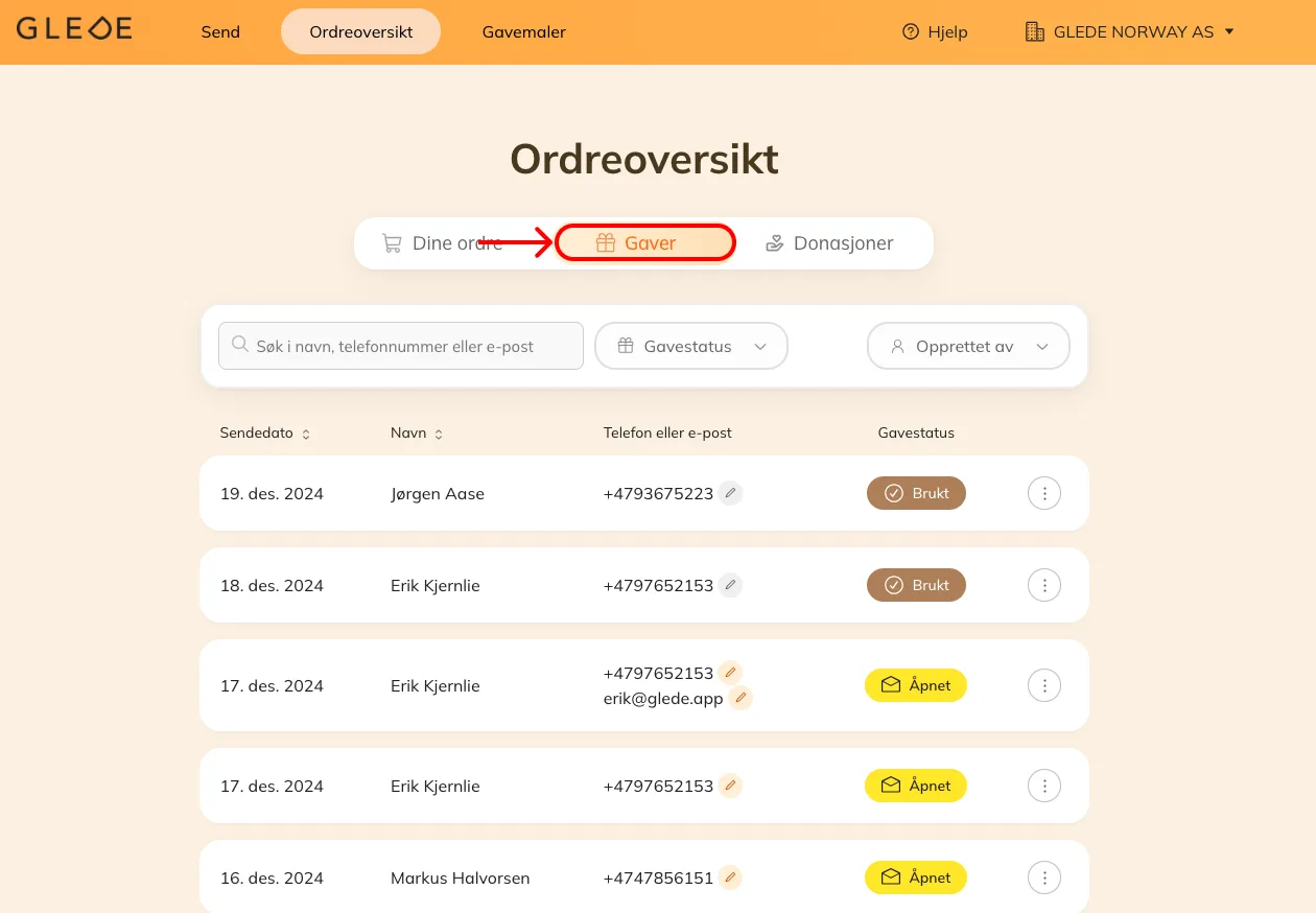Klikk på fanen "Gaver" for å se detaljer om alle gavekortene som er sendt ut.
