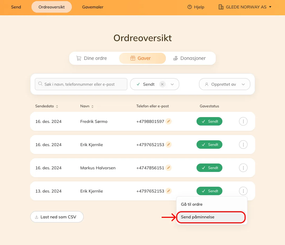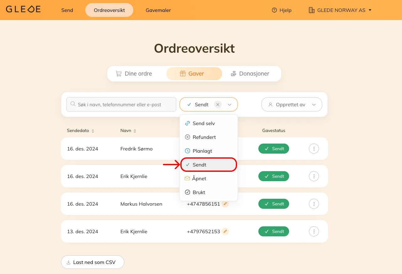 Med dette verktøyet kan du følge opp flere gaver samtidig, uten å måtte åpne hver enkelt ordre. Dette sparer deg for tid og gjør oppfølgingsprosessen mer effektiv.