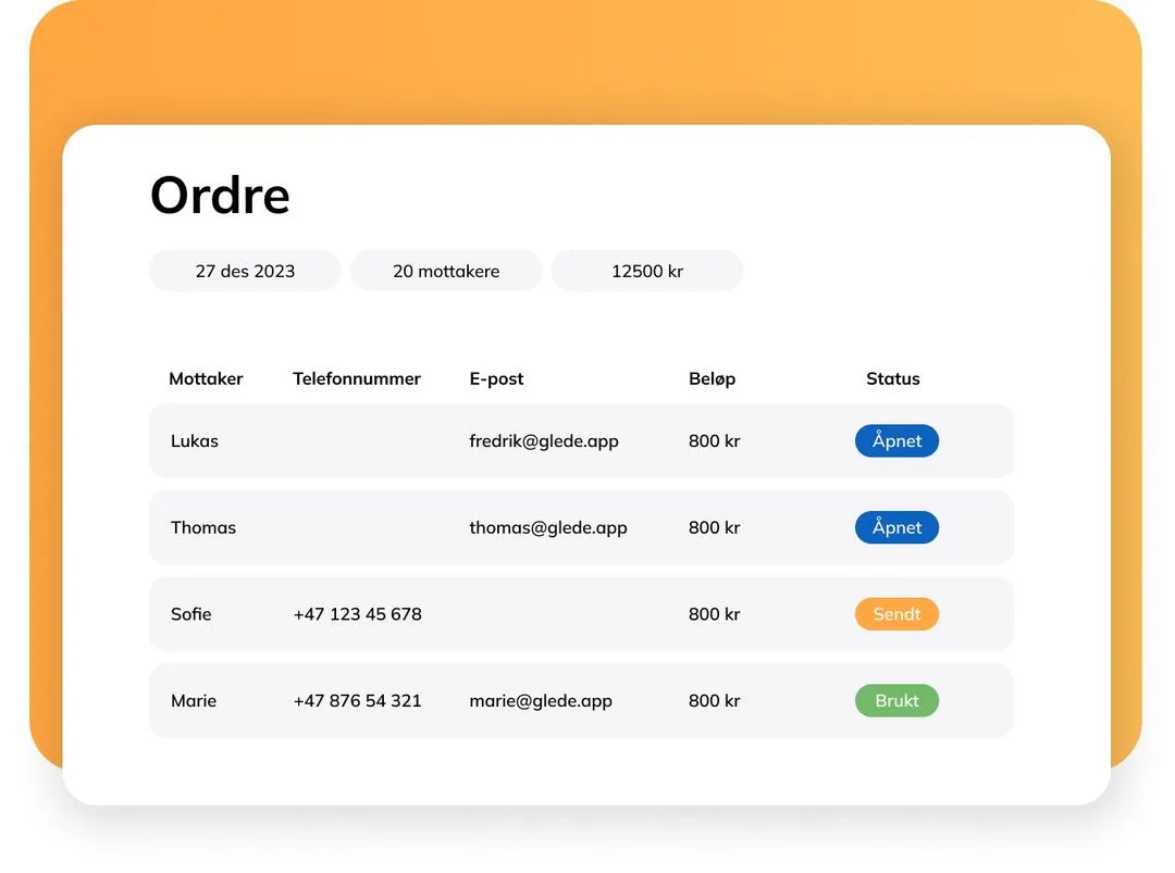 Glede-plattformen tilbyr muligheten til å planlegge fremtidige utsendelser og få full oversikt over bruken av gavekortene i etterkant. Dette gjør det enkelt for bedriften å holde styr på hvilke gaver som er sendt ut og hvordan de blir brukt. Det gir også et datagrunnlag for å vurdere effektiviteten av gaveprogrammet og gjøre nødvendige justeringer.